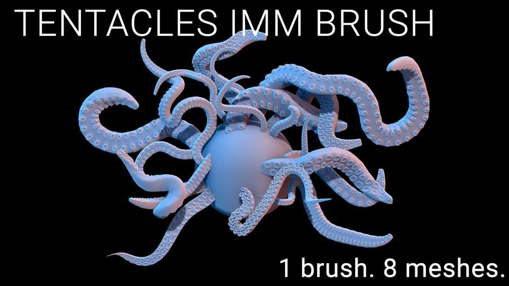 Zbrush IMM Curve brush with 8 tentacle variations. Includes one brush, one curve profile.