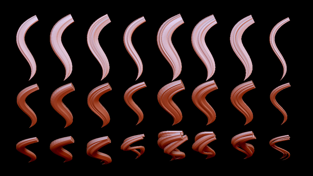 Also including five (5) curve falloff profiles (stroke-curve modifiers) (.zcv files). One for basic tapered strands; one for straighter strands good for bangs and straighter hair cuts, a 'bell curve' falloff, and a couple other stylized types. Load the curves into the stoke>curve falloff for easy switching between them